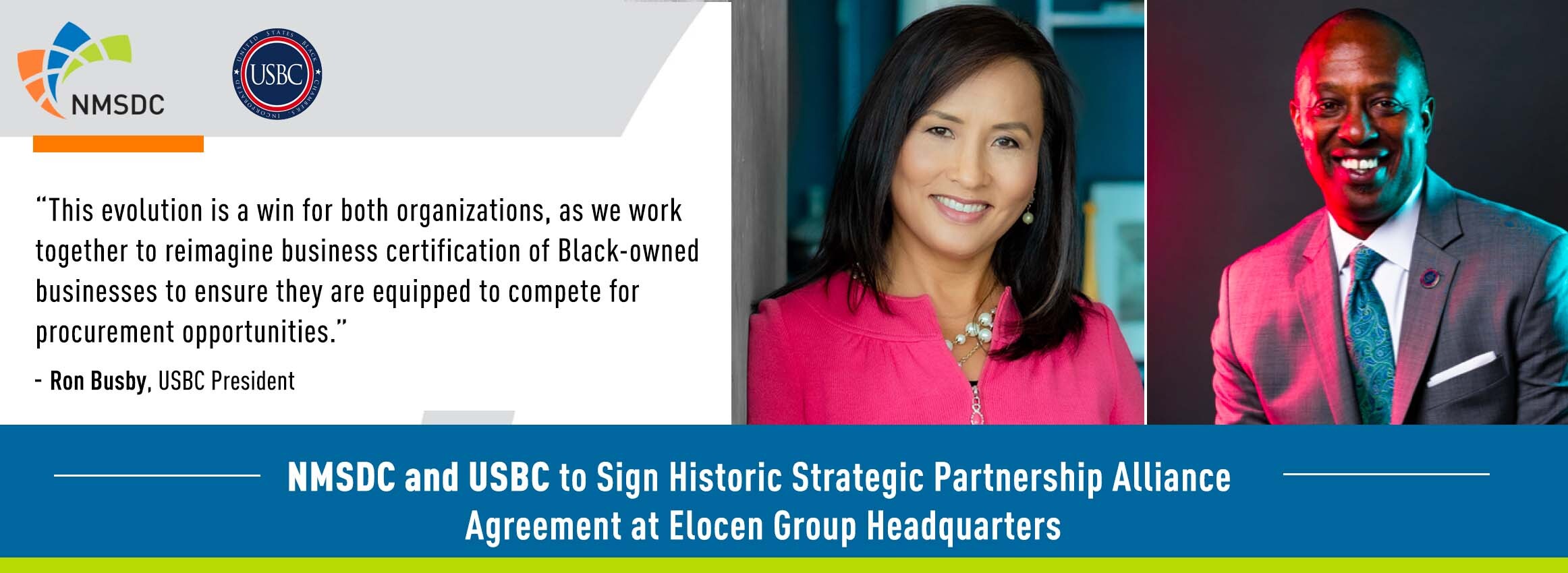 USBC CEO and President Ron Busby Sr. and NMSDC CEO and President Ying McGuire will be signing the document on behalf of their respective organizations. In addition, the following leaders from the minority business community will be in attendance: